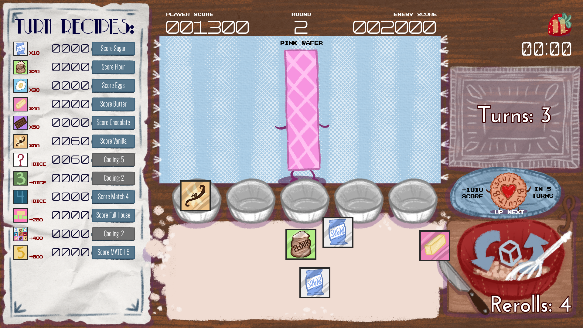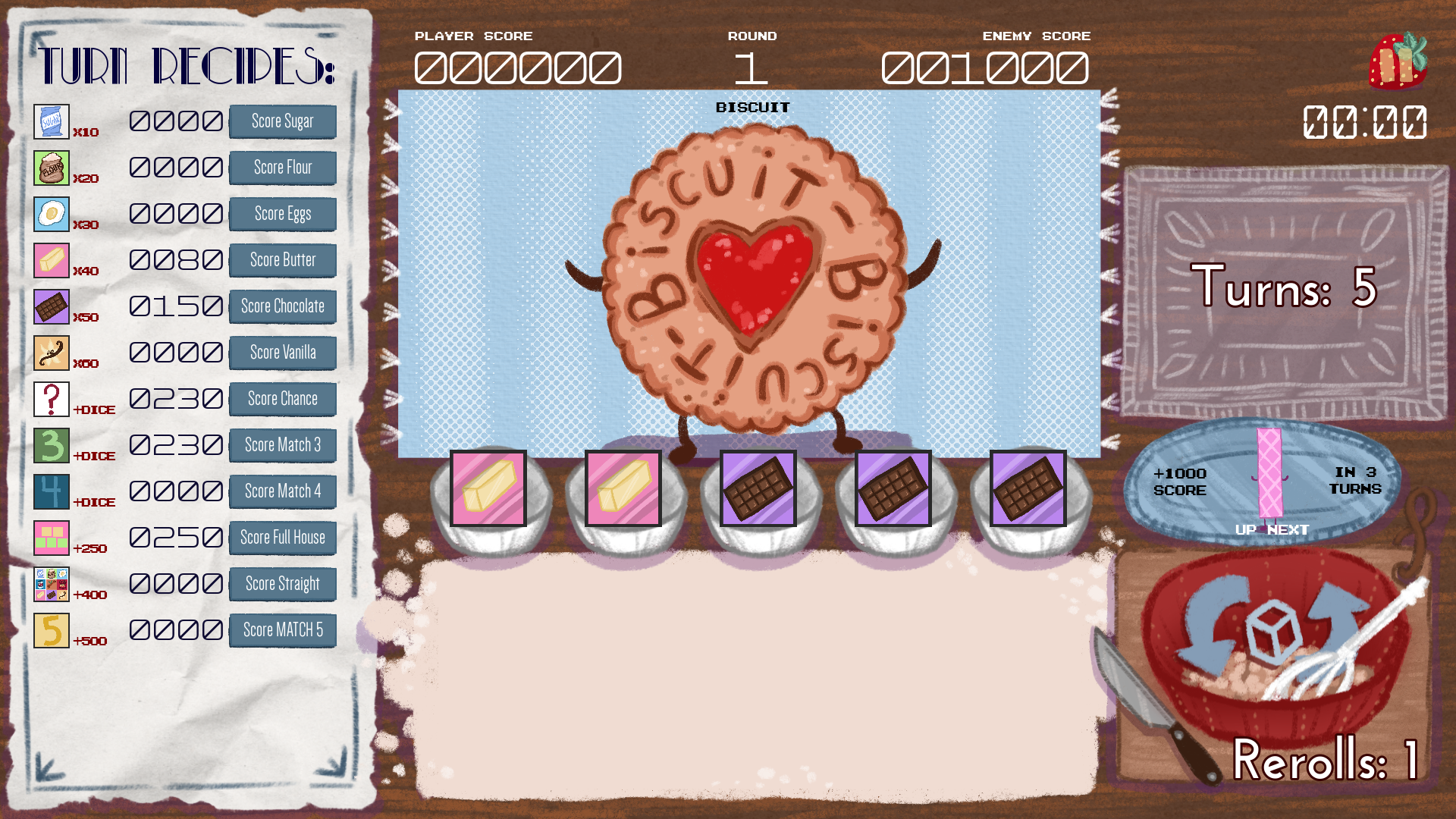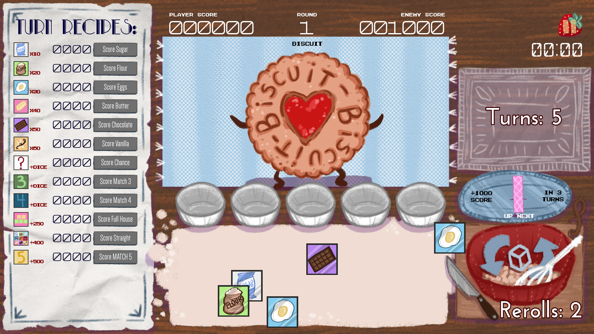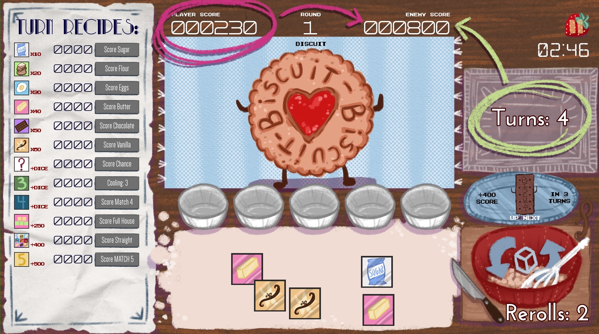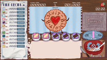 - You have only so many turns to defeat the enemy score, or game over. If you are victorious, a new biscuit spawns in and the battle continues
