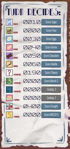 - When your dice are locked in place, choose a recipe to score and end your turn